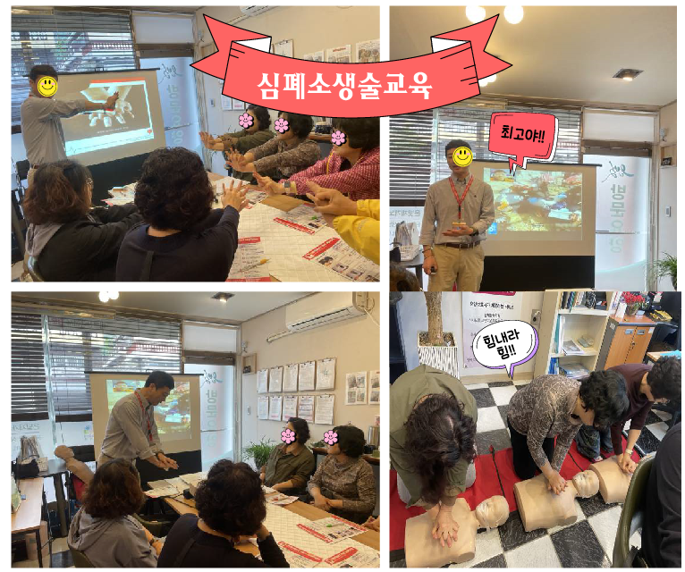 어르신들의 섬기다 혹시나 있을 응급상황에 대비하여 강사님 초청하여 심폐소생술을 배우는데